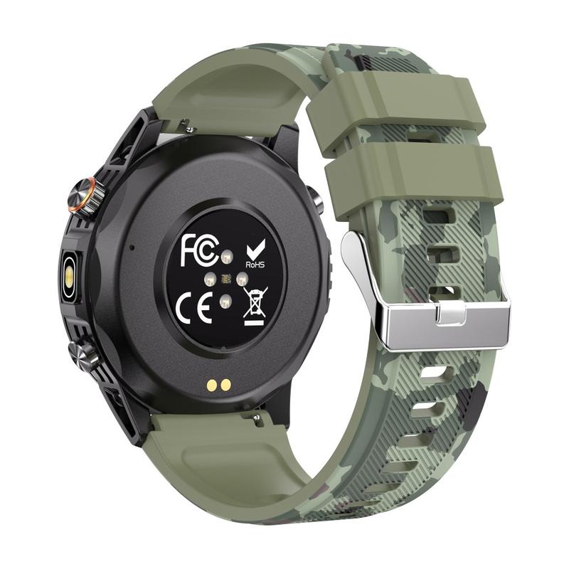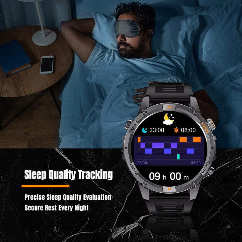Concebido para aventuras ao ar livre, o relógio possui uma lanterna incorporada, posicionamento GPS e uma bússola digital, ajudando-o a navegar em trilhos e a seguir os seus percursos com confiança. A sua bateria de alta capacidade de 580 mAh oferece um desempenho duradouro, proporcionando até 40 dias de tempo de espera e aproximadamente 7 dias de utilização regular. Com uma classificação IP68 à prova de água, resiste à chuva, salpicos e natação sem preocupações.
