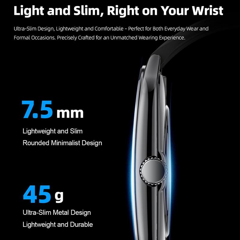 A maioria dos relógios de estilo empresarial força uma troca entre design fino e duração da bateria. O MT61 inclui uma pilha de 200 mAh numa caixa de 7,5 mm, conseguindo até cinco dias de utilização normal. O seu painel AMOLED curvo rivaliza com os telemóveis topo de gama em termos de profundidade de cor, e os sensores de saúde multiponto transformam as estatísticas diárias em tendências acionáveis - tudo isto sem tirar o telemóvel do bolso.