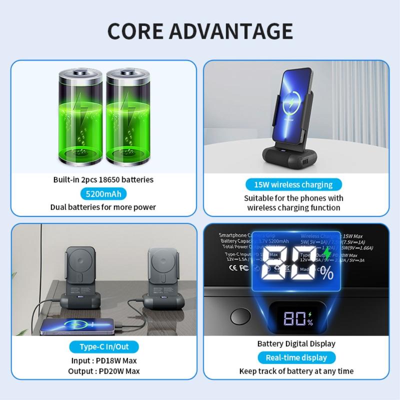 - Carregamento sem fios de 15W: Suporta carregamento sem fios de 15W para manter o telemóvel ligado enquanto fotografa. Compatível com todos os smartphones que suportam carregamento sem fios.