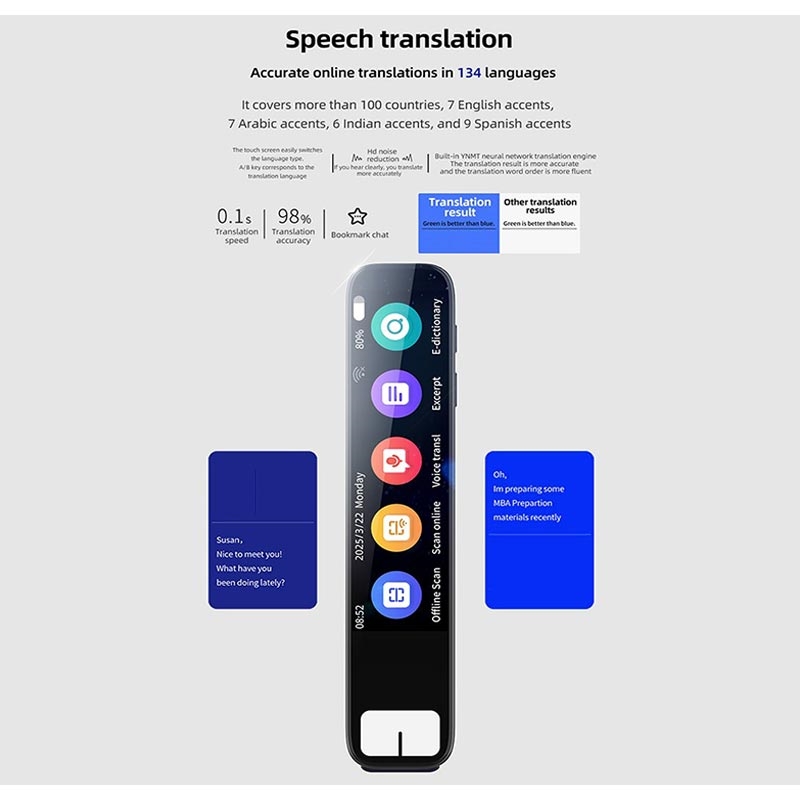 A tradução de fotografias utiliza a tecnologia de reconhecimento ótico de caracteres (OCR) para digitalizar e traduzir instantaneamente texto a partir de imagens, o que a torna especialmente útil para ler sinais, menus ou documentos enquanto viaja. A tradução de voz em 134 idiomas também torna o S08B um dos tradutores portáteis mais versáteis disponíveis.