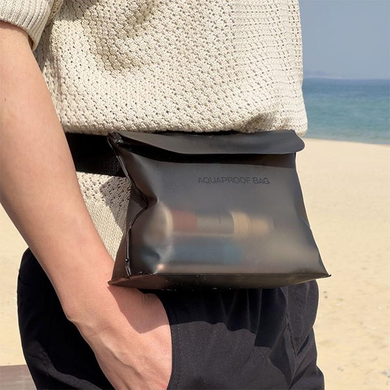 Uma peça do kit substitui os sacos improvisados com fecho de correr e os volumosos sacos secos com tampa de enrolar. A abertura larga torna a embalagem fácil, a placa inferior mantém tudo na vertical e o invólucro opaco impede olhares oportunistas. Em suma: menos confusão, mais liberdade, melhores recordações.