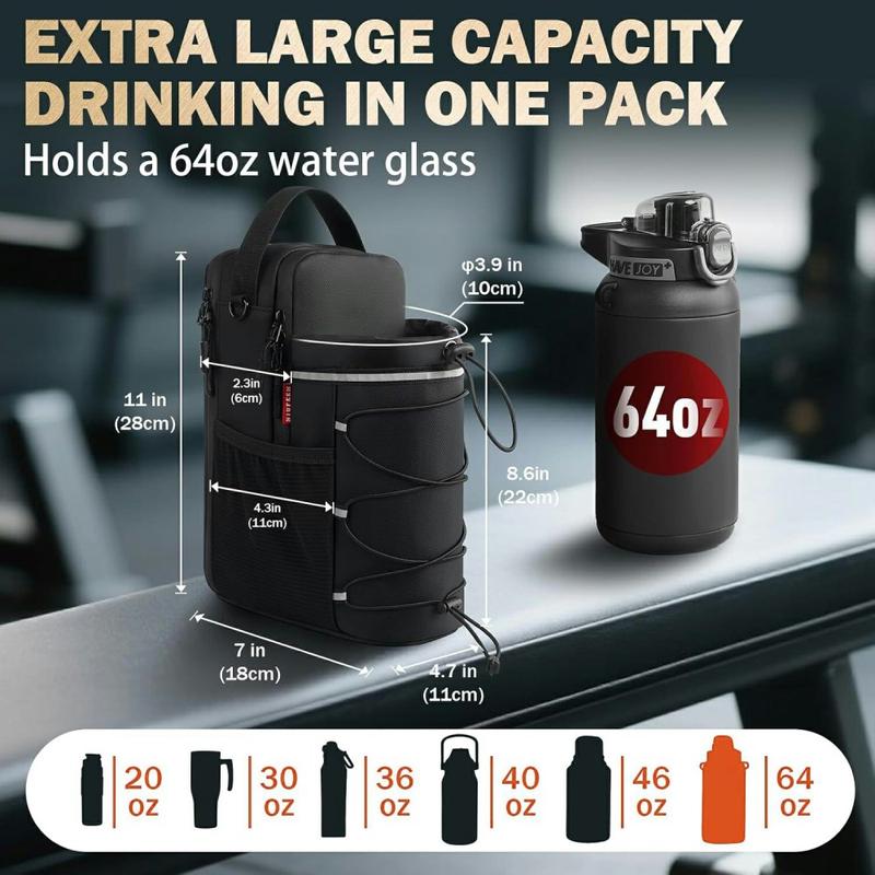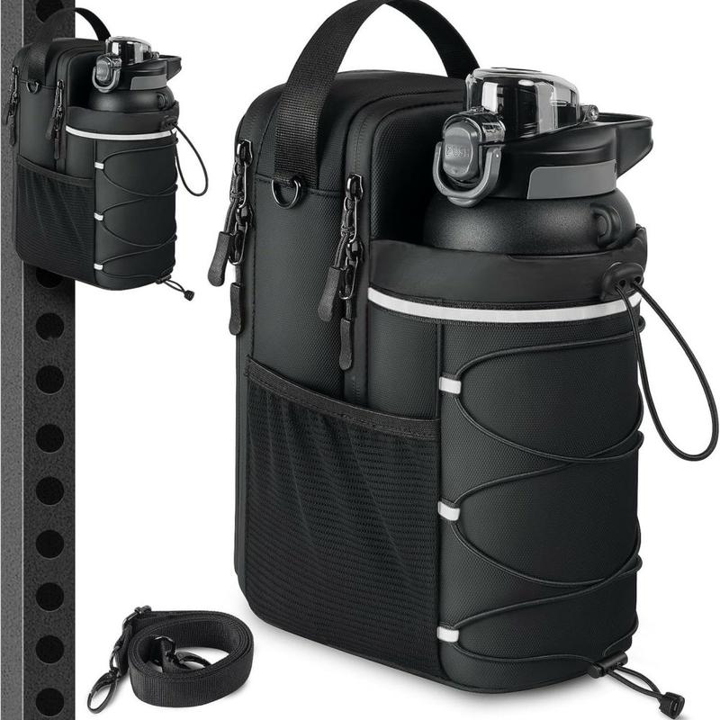 A hidratação com as mãos livres alia-se a um estilo urbano elegante: esta funda impermeável em PU-poliéster inclui ímanes poderosos que prendem uma garrafa de 1,9 L / 3 kg a equipamento de ginásio metálico - ou ao seu frigorífico - enquanto os bolsos com fecho de correr mantêm o telemóvel, as chaves e os cartões intactos.