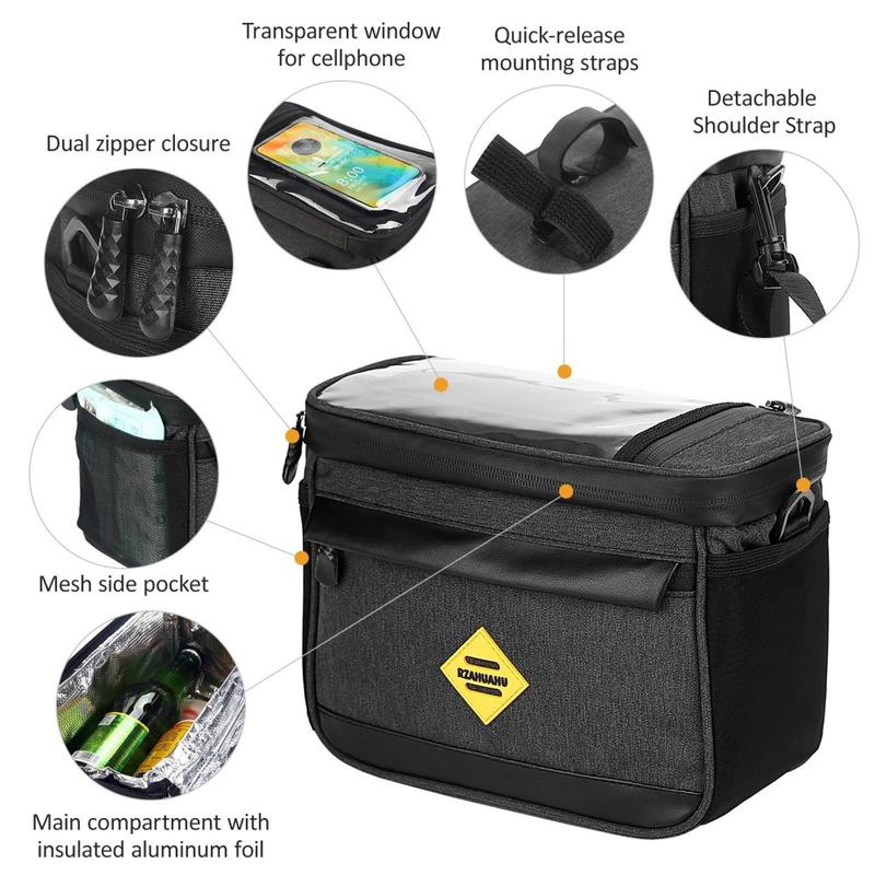 Saco térmico isolado para bicicleta multifunções para ciclismo Saco térmico isolado para bicicleta antidesgaste resistente à água com suporte para telemóvel para bicicleta - Cinzento