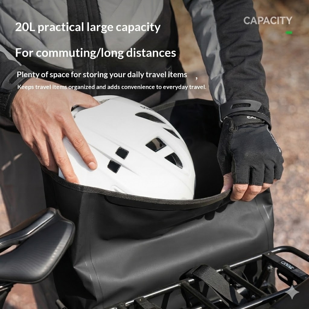 Transporte os seus itens essenciais com mais conforto em cada passeio com a bolsa traseira ROCKBROS AS-166. Concebida para deslocações diárias, passeios de bicicleta e ciclismo no dia-a-dia, esta versátil bolsa de 20litros combina arrumação prática com proteção fiável contra as intempéries. A construção com fecho enrolável permite ajustar o tamanho da bolsa de acordo com a sua carga, tornando-a tão útil para as tarefas diárias como para passeios mais longos ao fim de semana.