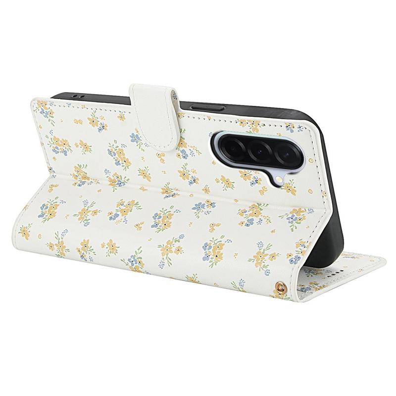 Refresque o seu Samsung Galaxy A17, Galaxy A26 com uma carteira flip fina que combina proteção segura e praticidade no dia a dia. A frente com costuras rômbicas e o padrão floral minúsculo conferem um estilo elegante, enquanto uma capa em TPU suave amortece as quedas e um revestimento em poliuretano protege contra riscos. Múltiplas ranhuras para cartões, um bolso para dinheiro e uma correia de pulso incluída fazem desta bolsa a solução de transporte ideal para deslocações, viagens ou saídas à noite.