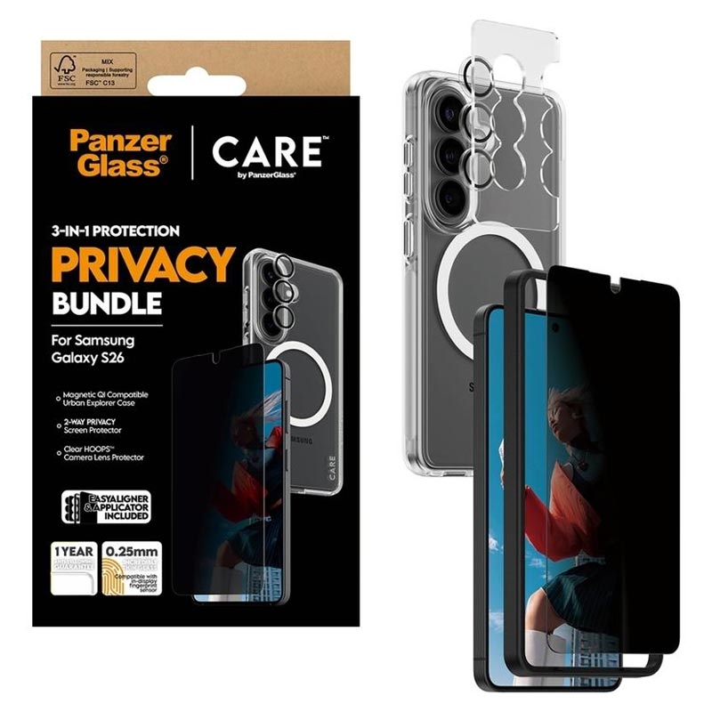 Care by PanzerGlass Pacote de Privacidade 3 em 1 para Samsung Galaxy S26 - Protetor de Ecrã de Privacidade, Protetor de Lentes Hoops, Capa CARE Urban Combat (3,6 m), EasyAligner