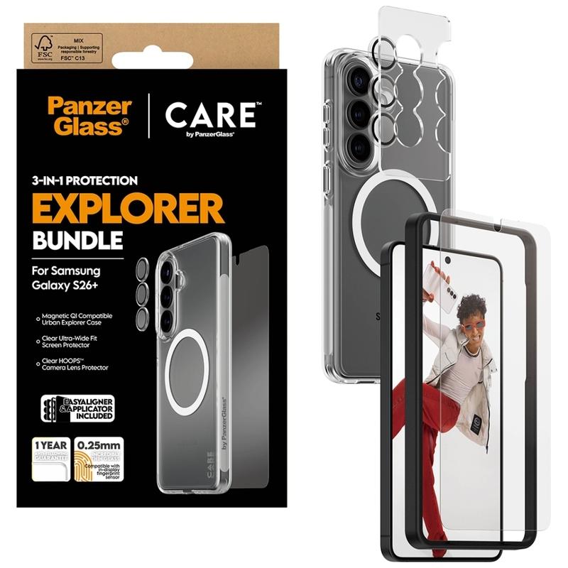 Care by PanzerGlass Pacote Explorer 3 em 1 para Samsung Galaxy S26+ - Protetor de ecrã + Protetor de lente Hoops + Capa magnética Urban Combat, EasyAligner