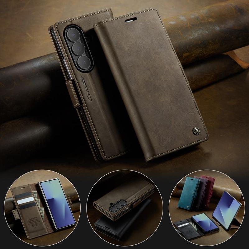 A Capa para Carteira CASEME 033 Series para Samsung Galaxy Z Fold7 é fabricada em poliuretano com textura de vitelo combinado com TPU, oferecendo proteção total contra riscos, impactos e desgaste diário, mantendo um aspeto elegante e de alta qualidade.