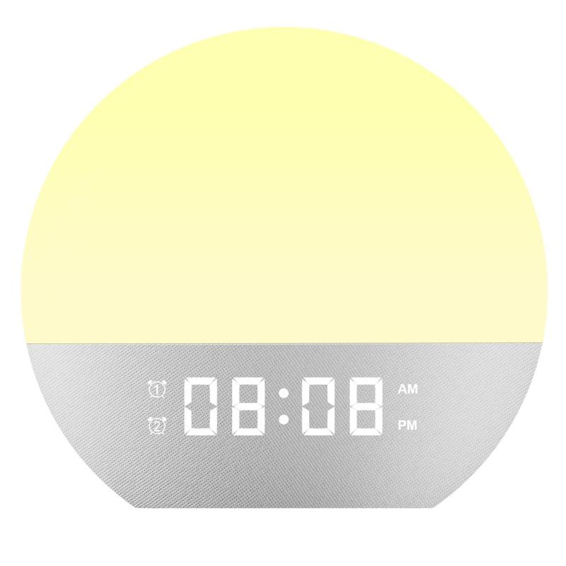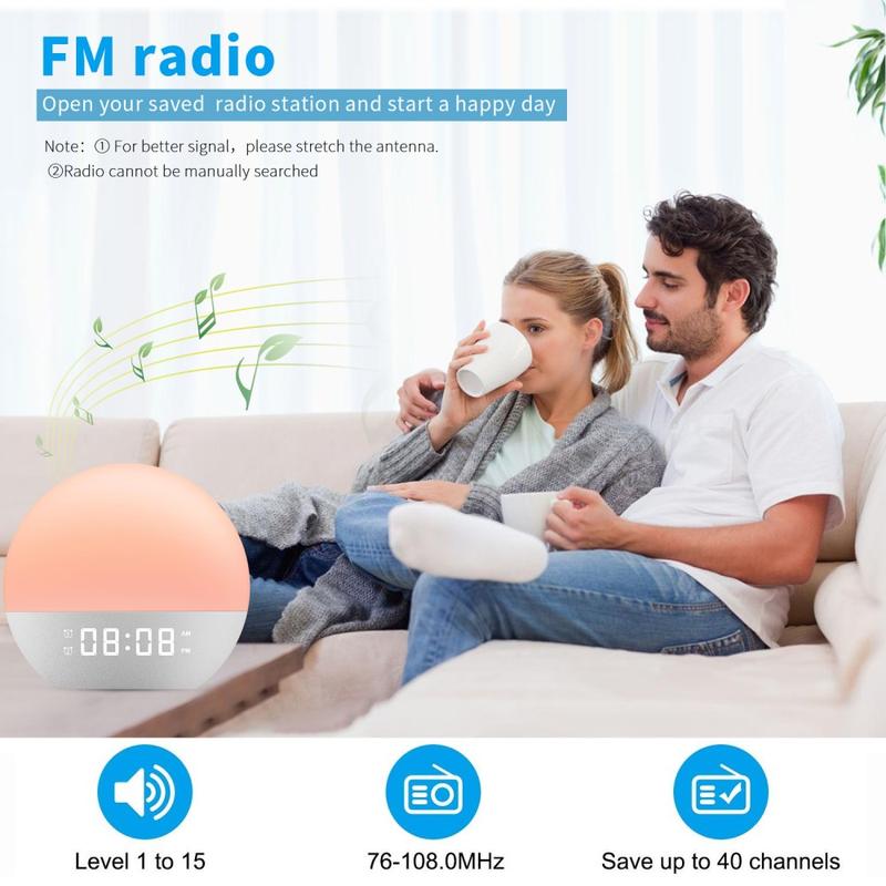 SH08 Despertador de cabeceira com luz LED com cores ambientais, ruído branco e rádio FM