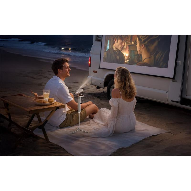 - Noite de cinema ao ar livre: coloque o suporte no chão, ajuste a altura para 33 cm ou 43 cm e ligue o projetor com a bateria integrada