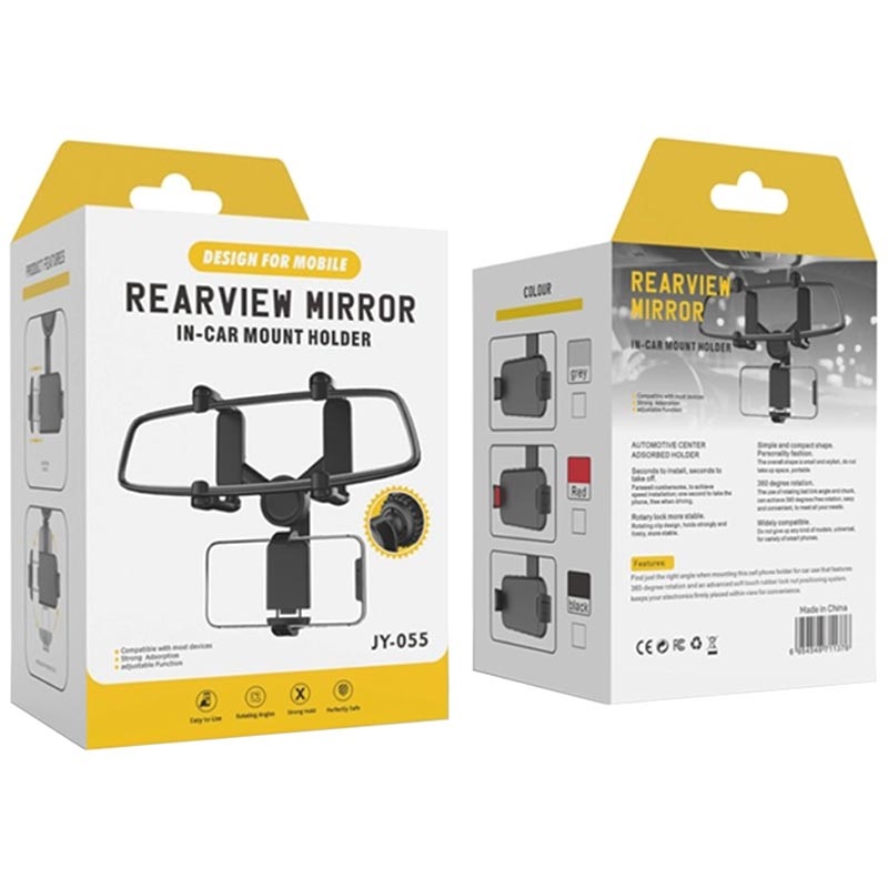 Suporte para telemóvel ajustável, com função de rotação a 360 graus. Fácil instalação e remoção, colocação no espelho retrovisor, e as quatro pinças ficarão firmemente presas ao espelho. É feito de material ABS durável, sólido e de alta qualidade. Além disso, o suporte para carro JY-055 é adequado para dispositivos que vão de 65mm a 95mm.