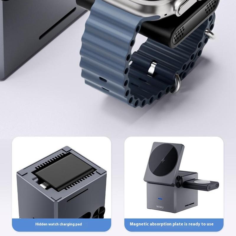 O WIWU Wi-W030 é um suporte de carregamento sem fios 3 em 1 versátil, concebido para alimentar o iPhone, o Apple Watch e os AirPods em simultâneo. Com o seu design dobrável e forte atração magnética, oferece comodidade e eficiência, tornando-o um acessório essencial para quem tem vários dispositivos Apple.