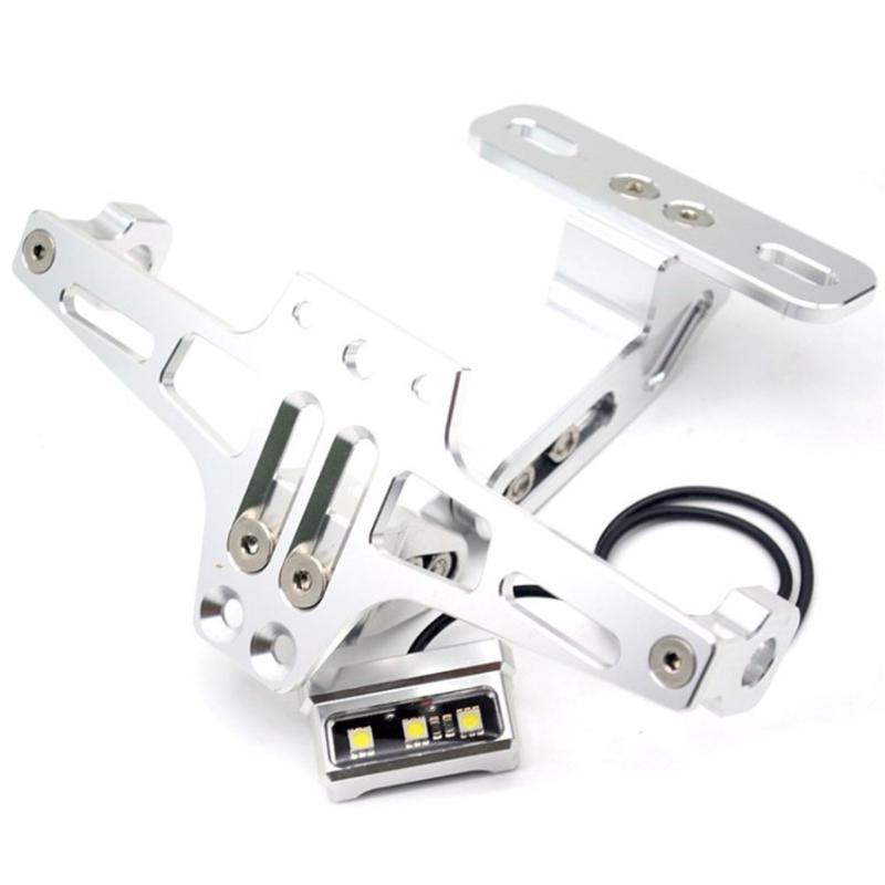 Suporte de matrícula de motociclo em liga de alumínio CNC ajustável Suporte telescópico de luz de bicicleta com luz LED - Prata