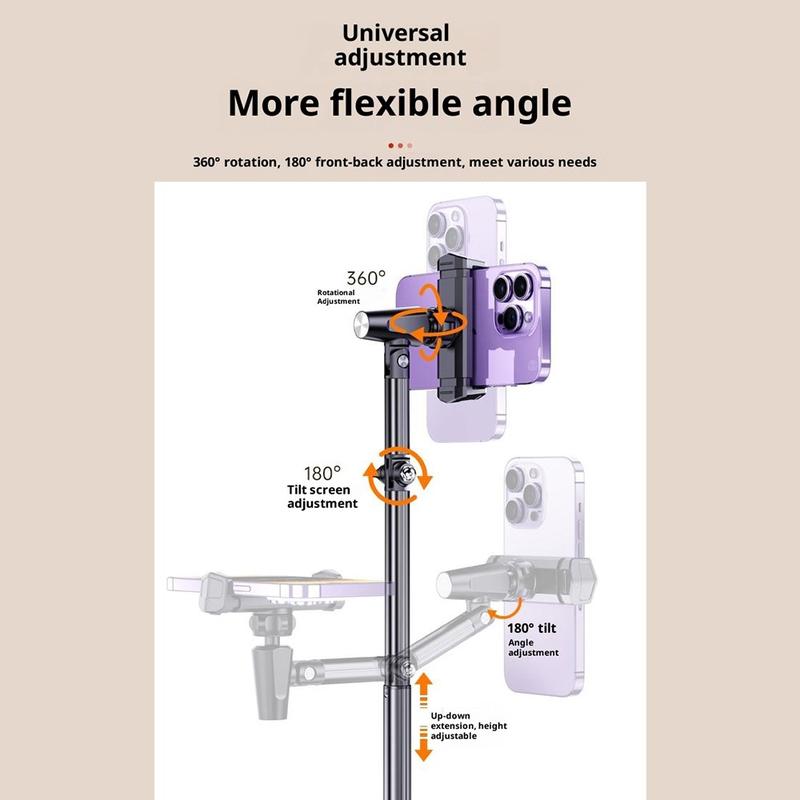 - Altura e ângulo ajustáveis - A haste metálica extensível permite um posicionamento versátil e o ângulo perfeito para filmagens aéreas, transmissões ao vivo ou gravações de mesa.