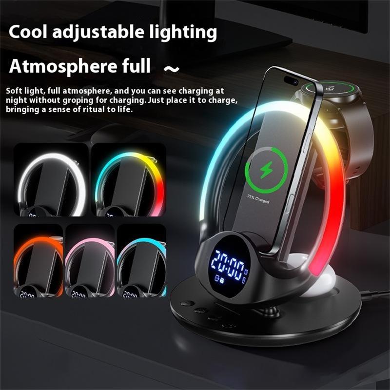 Mais do que um simples carregador - também funciona como um relógio digital e suporte para telemóvel. Escolha entre cinco modos de luz de fundo LED ambiente (branco, branco rosa, vermelho, azul gelo, cor fantasia) para combinar com seu humor ou decoração.