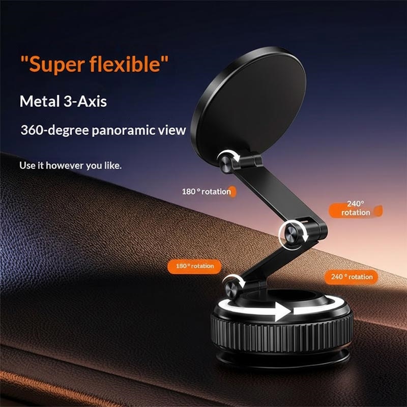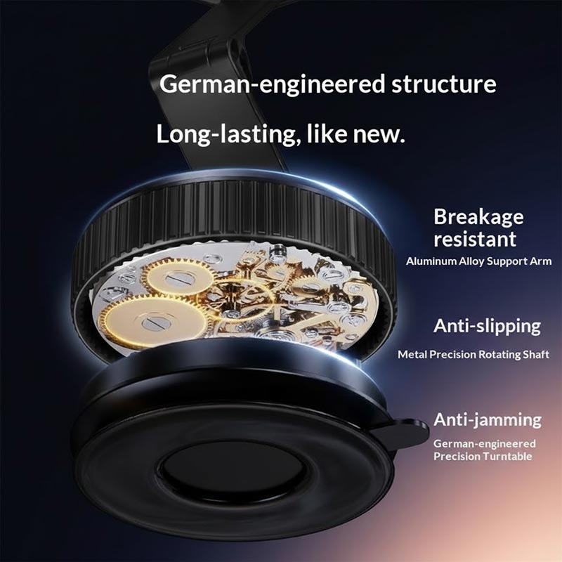 Construído com um braço triplo em liga de alumínio, o suporte permite um ajuste flexível em vários eixos: rotação da base em 360°, movimento da articulação central em 240° e ajuste da placa superior em 180°. Isto permite um posicionamento preciso para navegação, chamadas ou visualização de multimédia em qualquer ângulo.