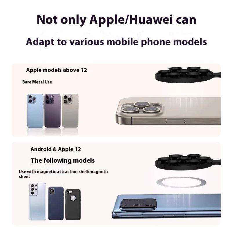 Doze ímanes de neodímio N52 juntam-se a um conjunto denso de ventosas de silicone para fixar o telemóvel em vidros, azulejos, metal ou painéis de instrumentos brilhantes em segundos. O campo magnético fechado mantém os dispositivos até 1 kg sem perturbar a receção de GPS ou 5G, enquanto a ventosa de vácuo se agarra mesmo em estradas esburacadas.