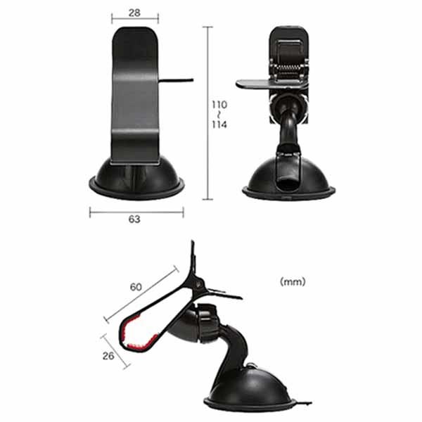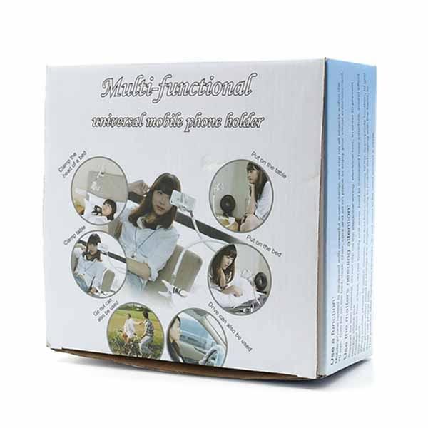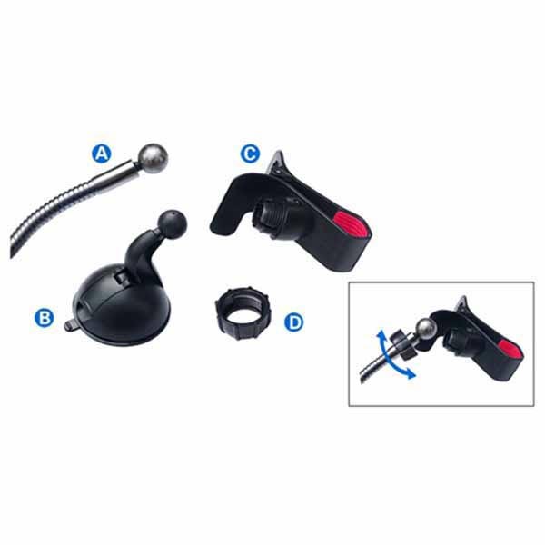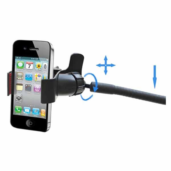 - Inclui três partes: um pescoço de ganso longo e flexível com um clipe de metal, um suporte com clipe de plástico para o telemóvel e um suporte ventosa