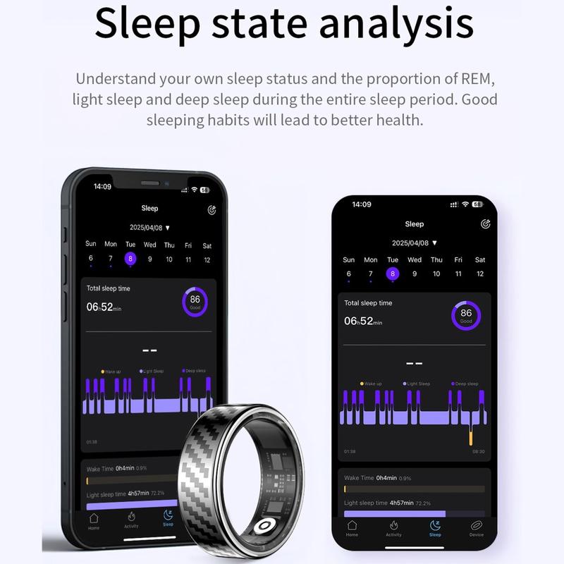 SY02 Anel inteligente com padrão de fibra de carbono - Monitor de sono, oxigénio no sangue e ritmo cardíaco com estojo de carregamento sem fios