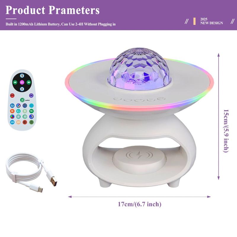 Adicione atmosfera, áudio e carregamento sem esforço a qualquer cabeceira ou espaço de trabalho. O TCSP-001-C projecta uma galáxia de cores, transmite música através de 5.0 compatível com Bluetooth e carrega o seu telefone sem fios - tudo num design compacto, recarregável por USB e com um prático controlo remoto.
