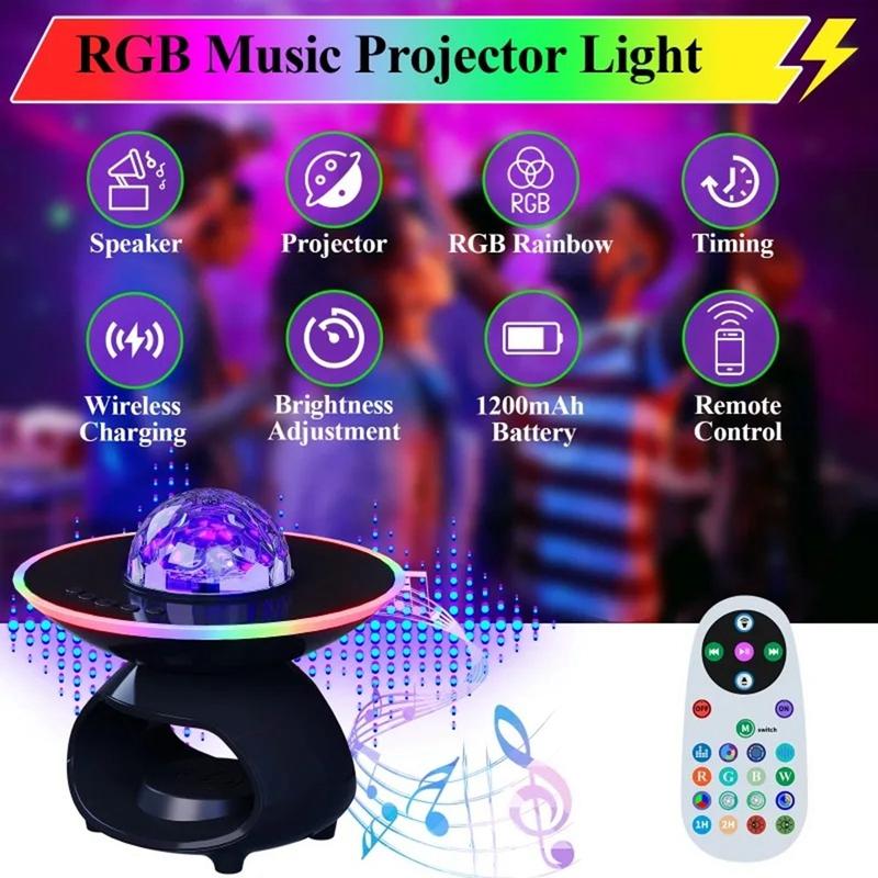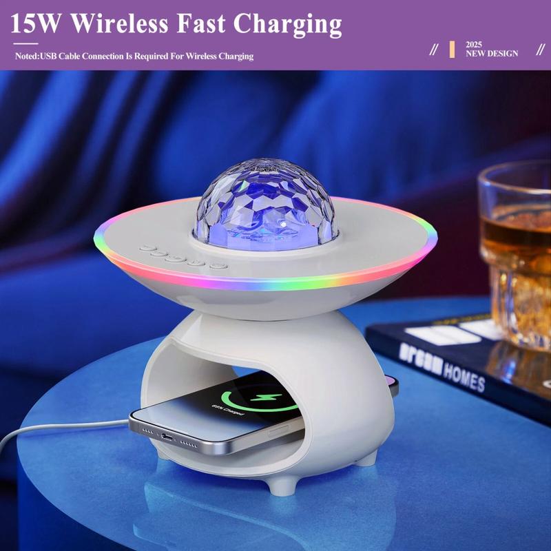 TCSP-001-C Lâmpada de projeção de estrelas 4 em 1 - Carregador sem fios de 15 W, altifalante Bluetooth 5.0 e luz ambiente RGB