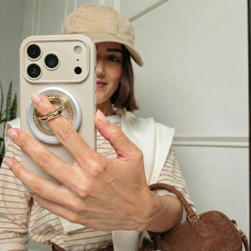 Fabricado com materiais duráveis e agradáveis ao toque, o anel oferece uma pegada segura para utilização com uma só mão, mantendo um visual refinado e moderno.