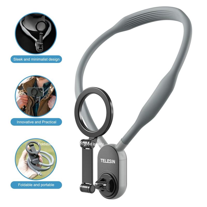• TELESIN MNM-001 Para iPhone 12 / 13 / 14 / 15/ 16 Suporte de silicone para o pescoço Suporte magnético para telefone com bastão de selfie - Cinzento