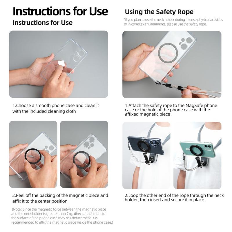 3. A utilização de cordas de segurança requer uma capa de telemóvel; uma extremidade da corda de segurança é atada ao orifício da capa do telemóvel; coloque a outra extremidade no pescoço suspenso, bloqueie o pescoço suspenso e puxe a fivela de ajuste da corda de segurança até ao mínimo