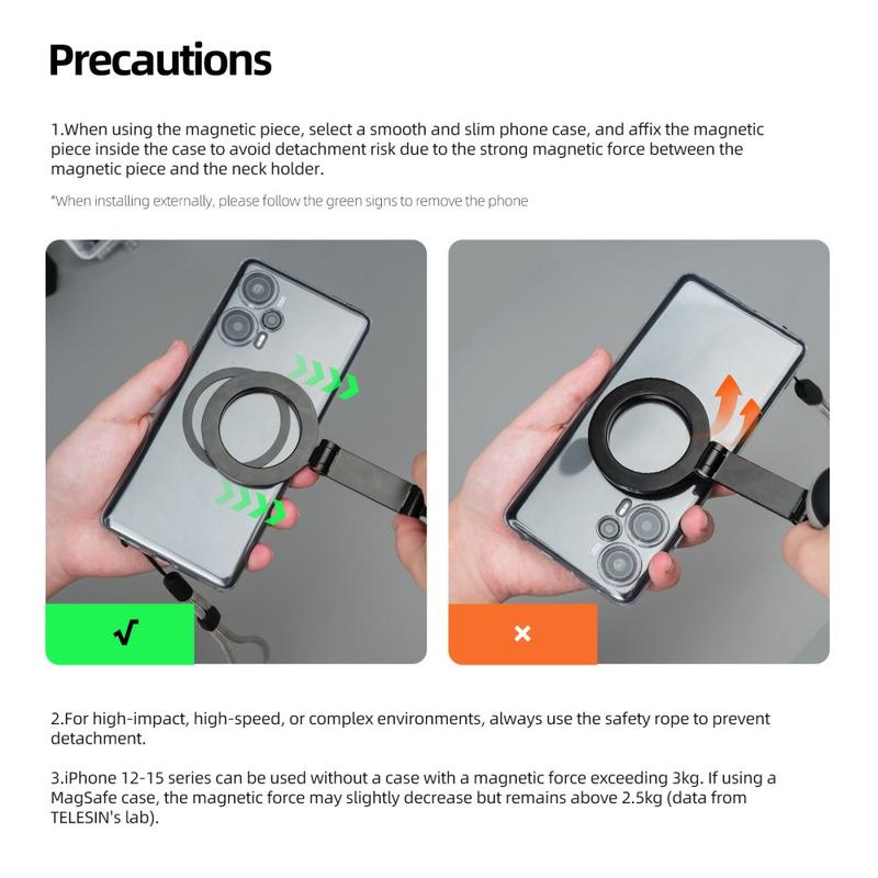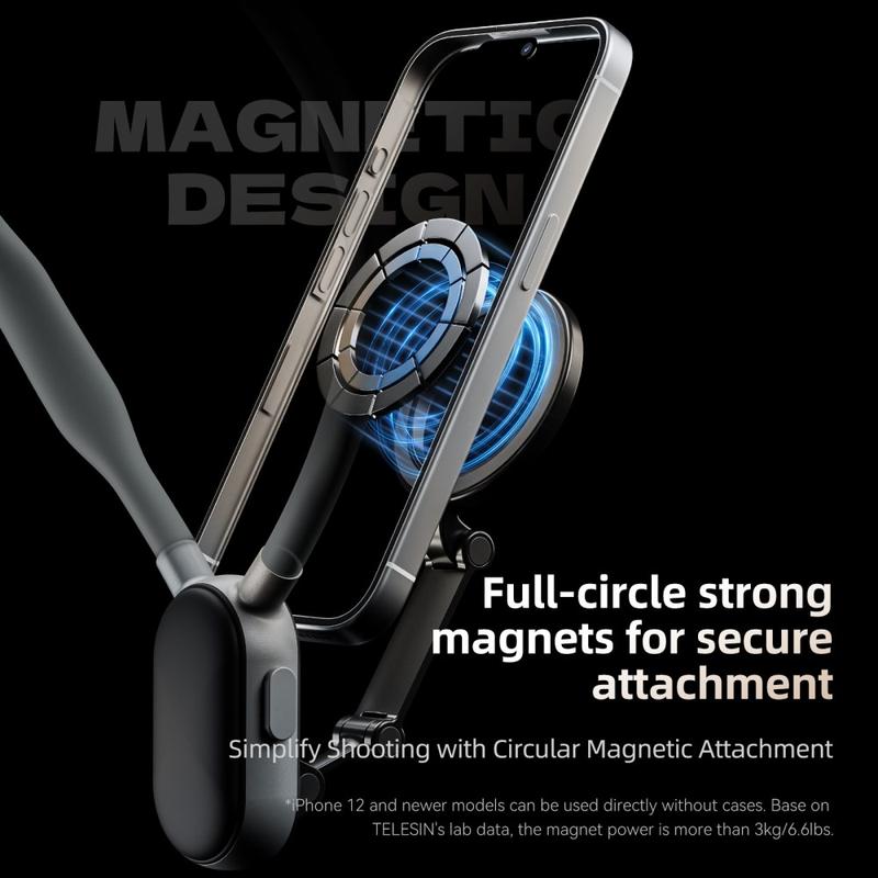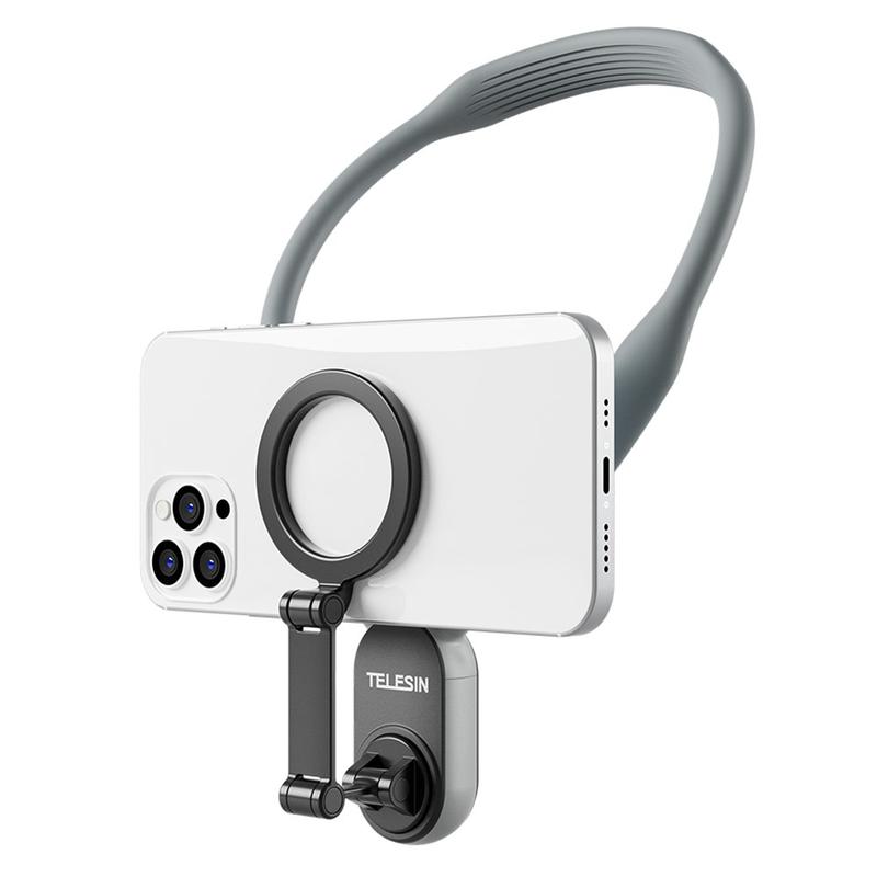 TELESIN MNM-001 Para iPhone 12 / 13 / 14 / 15/ 16 Suporte de silicone para o pescoço Suporte magnético para telefone com bastão de selfie - Cinzento