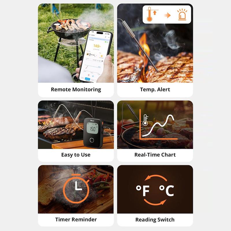 - Cozinhar no interior e no exterior: Monitorize assados, aves ou peito sem abrir o forno ou o grelhador, mantendo o calor e o sabor.
