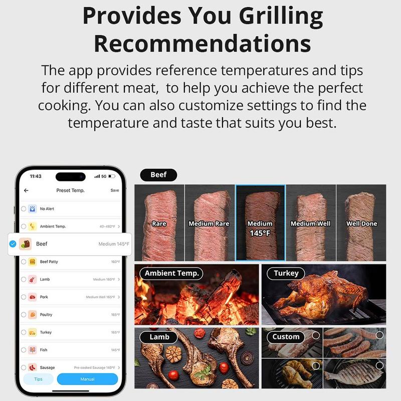 - Maior segurança na cozinha: O monitoramento das temperaturas internas da carne ajuda a prevenir doenças transmitidas por alimentos, garantindo que as carnes sejam cozidas completamente.