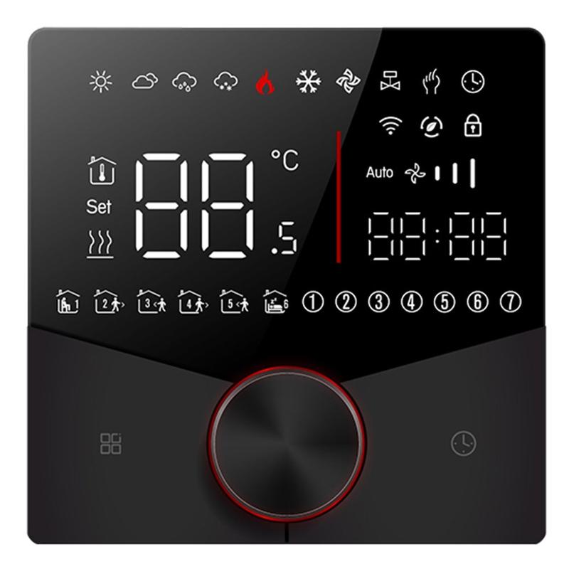 Este termóstato inteligente suporta vários métodos de controlo, incluindo Wi-Fi, Modbus e acesso por cartão de quarto, tornando-o adequado para uma vasta gama de configurações de aquecimento. Através da aplicação Tuya, pode ajustar a temperatura remotamente e gerir o aquecimento mesmo quando está fora de casa. Também funciona com a Amazon Alexa, o Google Home e o Tmall Genie, dando-lhe a opção de controlar as definições com comandos de voz simples para maior comodidade.