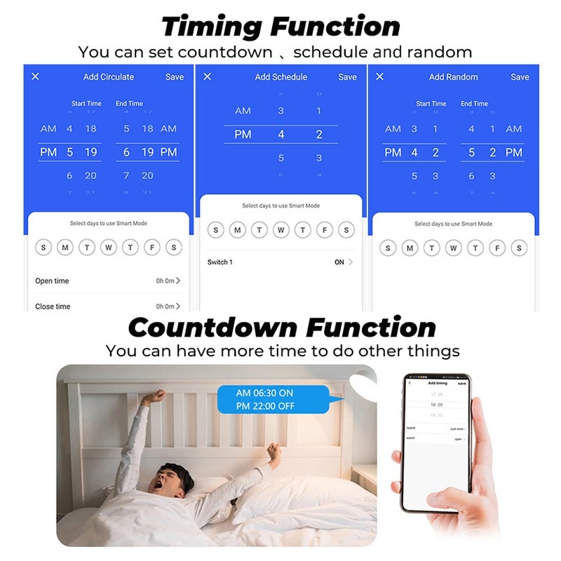 Crie rotinas personalizadas — por exemplo, ligue o ventilador da sala ao nascer do sol ou desligue a luz de presença do seu filho automaticamente na hora de dormir. O temporizador de contagem decrescente e as funcionalidades "configure e esqueça" garantem que nunca mais terá de se preocupar em deixar os aparelhos ligados.