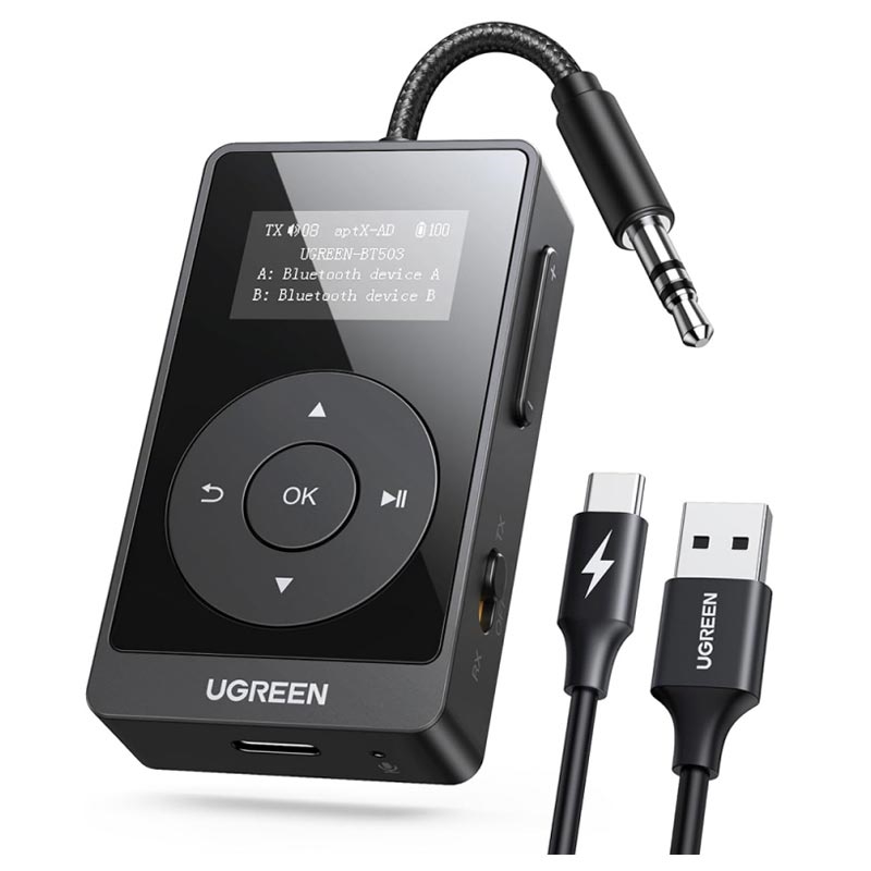 Transmissor e recetor Bluetooth 5.3 2 em 1 Ugreen BT503 - aptX Adaptive/HD (TX), ecrã LED, bateria com até 32 horas de duração, AUX de 3,5 mm, suporte para dois auscultadores
