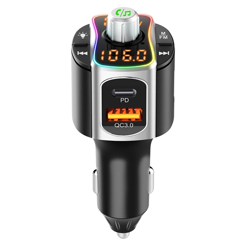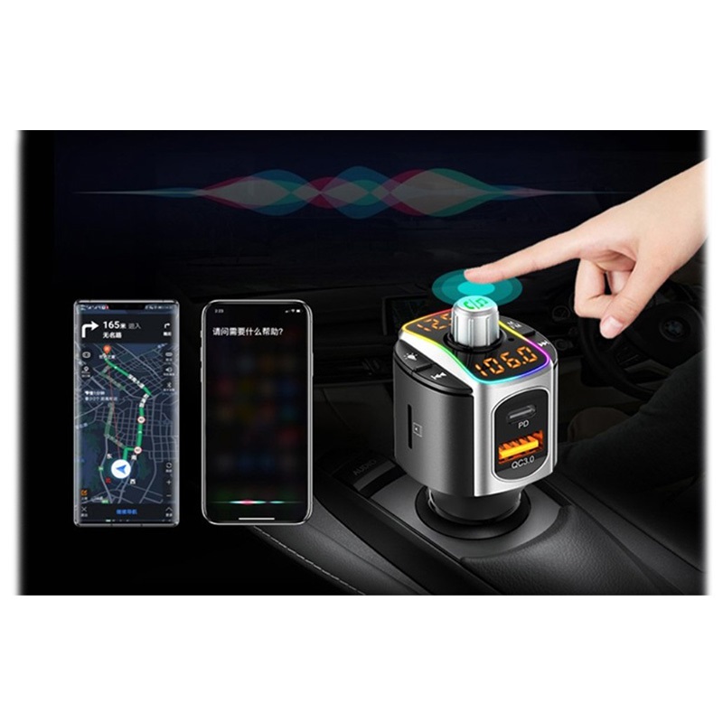 Transmissor FM Bluetooth e Carregador Rápido de Carro com Luz LED BC67 - USB-A QC 3.0, USB-C PD, 15W