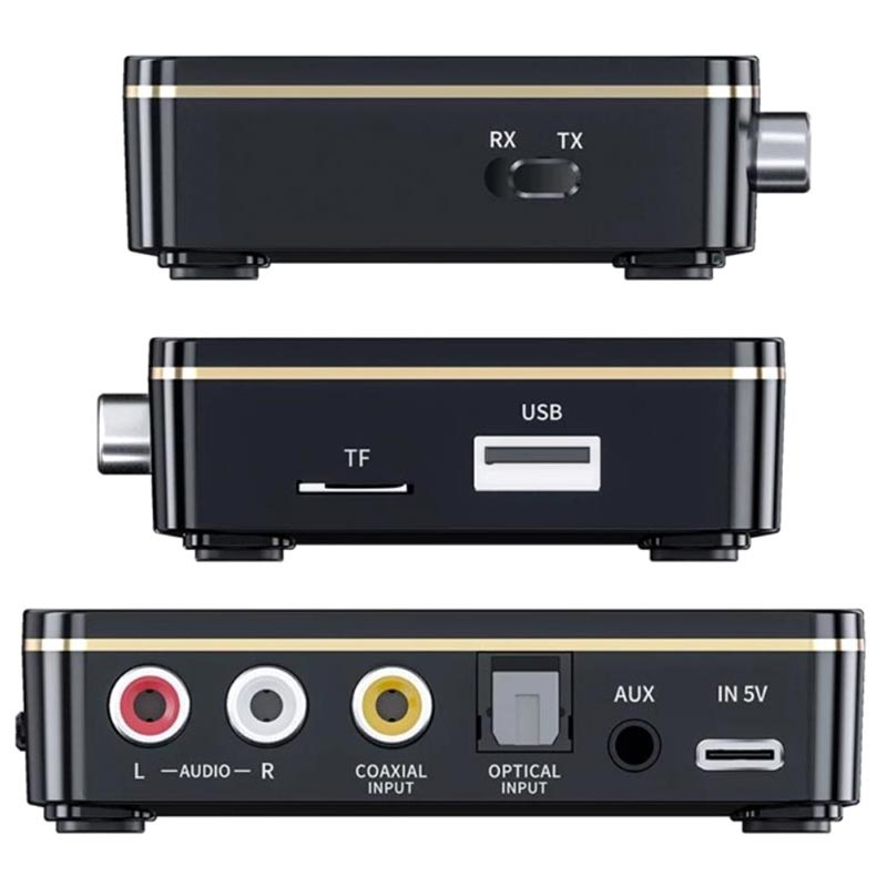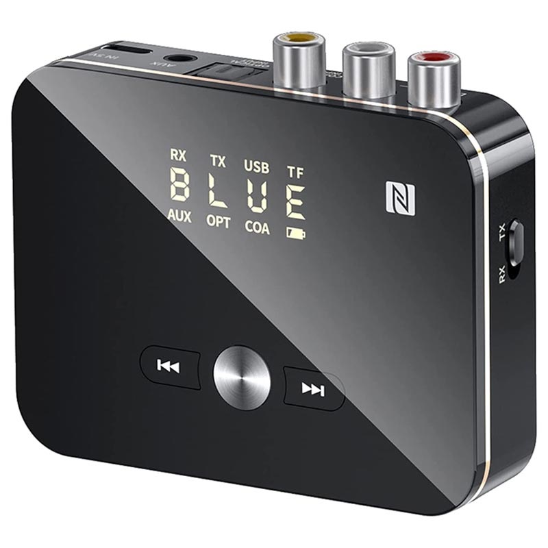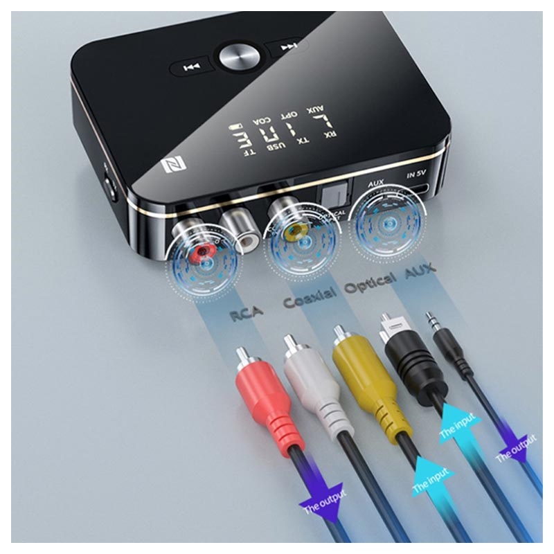 Utilize o transmissor/recetor M8 Bluetooth 5.0 para ligar convenientemente o seu smartphone, portátil, TV, ou projetor às suas colunas ou auscultadores sem fios. Inclui AUX de 3,5 mm, RCA, coaxial, fibra ótica, porta USB, ranhura para cartão TF para compatibilidade ultra ampla, enquanto o seu suporte NFC permite emparelhá-lo com o seu smartphone ou tablet em apenas dois segundos. Este transmissor/recetor 2 em 1 Bluetooth tem um visor digital LED que mostra o estado de funcionamento e o modo Bluetooth selecionado (transmissor - TX, ou recetor - RX). Ainda para mais, vem com um controlo remoto de infravermelhos com um alcance operacional de até 8 metros, para uma gestão mais prática.