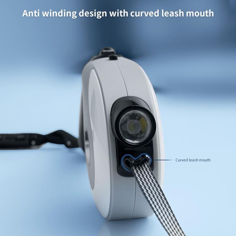 - Saída da trela anti-enrolamento: O design curvo evita que a trela se enrosque, garantindo uma retração e extensão suaves.