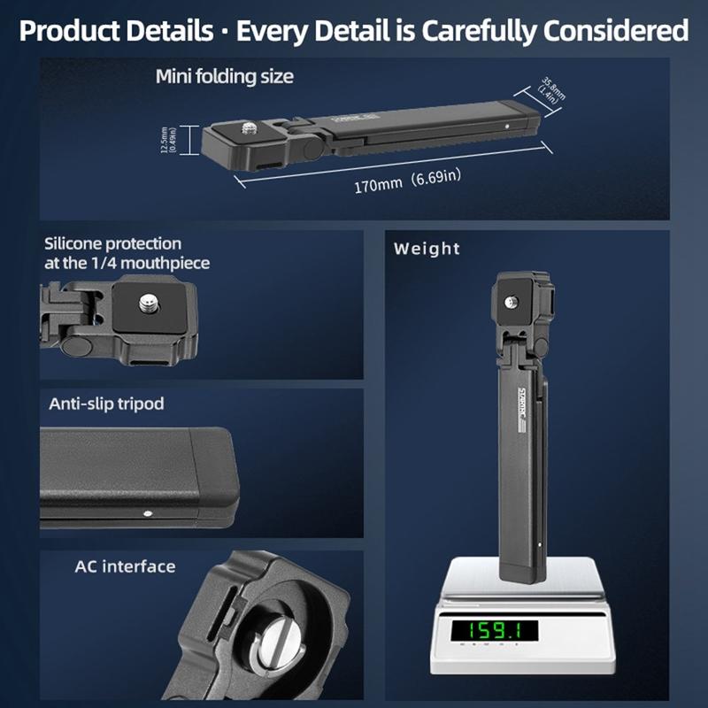 Fabricado em liga de alumínio de qualidade aeroespacial, o tripé pesa apenas 160 g, oferecendo excelente resistência e resistência à corrosão. O acabamento anodizado aumenta a durabilidade para uso ao ar livre e em todas as condições meteorológicas.
