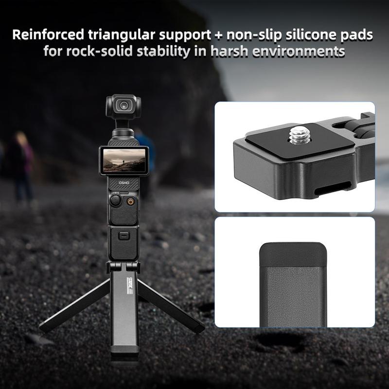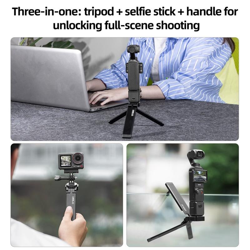 Equipado com uma rosca padrão de 1/4", o tripé é compatível com uma ampla gama de dispositivos, incluindo a série DJI Pocket, câmaras de ação, câmaras compactas e acessórios. Um adaptador GoPro está incluído para maior versatilidade.