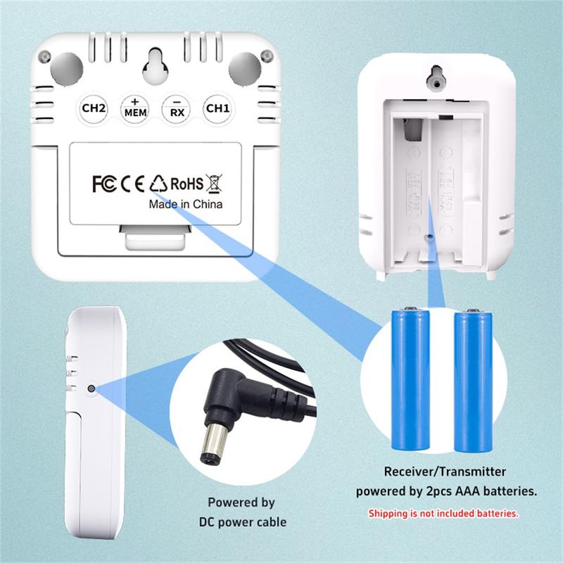 - Alimentação do recetor: cabo de alimentação CC ou 2 pilhas AAA (não incluídas)