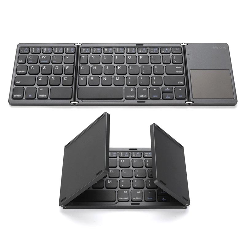 Small and thin, this universal Bluetooth keyboard with touchpad can always be with you. Its foldable design makes it very compact and easy to carry anywhere. Bluetooth technology means you don't have to occupy valuable USB ports with wireless receivers. The configuration is easy, and no installation or drivers are required. This ultra-thin double-fold keyboard easily adapts to your bag, and the keys are kept secure inside the durable double-fold construction.
