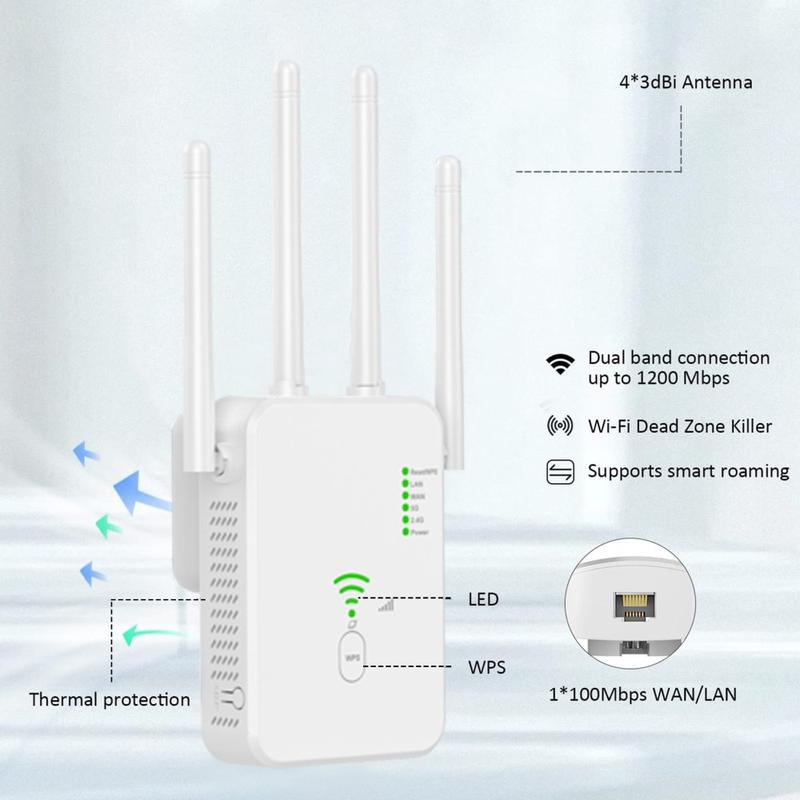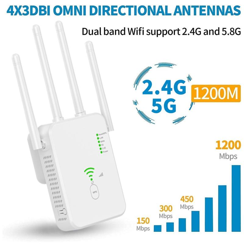 UNT-10 Booster / Router WiFi de banda dupla - Extensor de sinal sem fios de 1200 Mbps com 4 antenas - Ficha UE