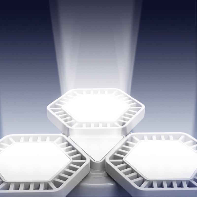 - Painéis triplos de ângulo amplo - 3 "folhas" dobráveis revestidas com 126 LEDs de alto rendimento banham grandes áreas com luz uniforme.