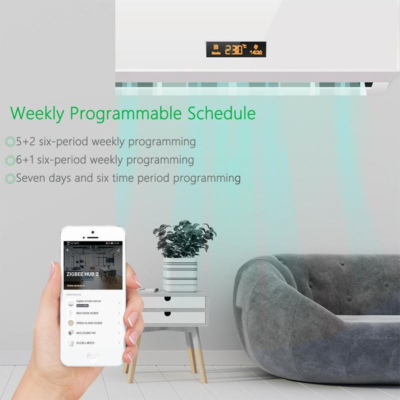 - Programador semanal - Seis blocos de tempo por dia, sete dias por semana, diretamente na aplicação Tuya - aqueça apenas quando precisar.