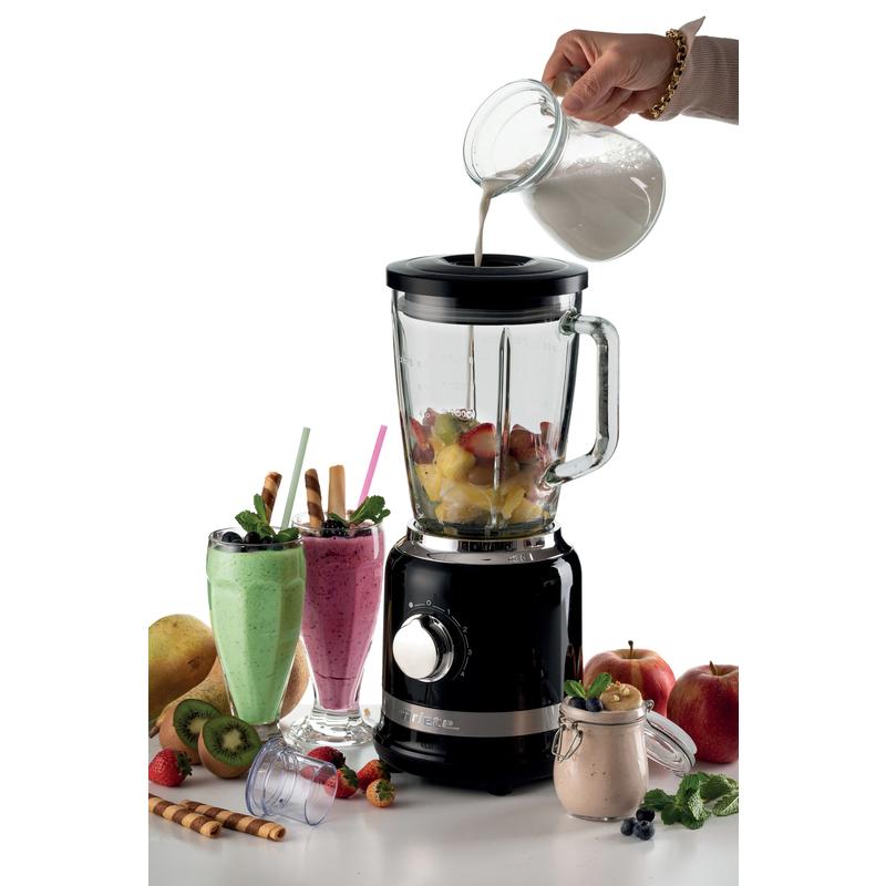 O liquidificador Ariete Moderna com um copo de vidro de 1,5 L é o aparelho de cozinha ideal para criar uma variedade de bebidas e receitas. Com o seu potente motor de 1000 W e 4 lâminas de aço inoxidável, mistura sem esforço batidos, tritura gelo e faz puré de legumes. O liquidificador oferece 4 velocidades e uma função Pulse, permitindo-lhe personalizar a textura dos seus ingredientes. O copo de vidro é durável e prático, com uma escala de medição e uma tampa amovível para adicionar ingredientes a meio da mistura.