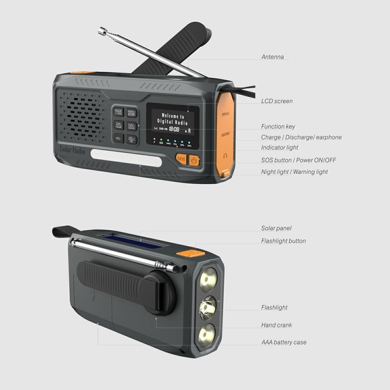 WR-6B Rádio de emergência solar com manivela DAB e lanterna LED - 40 estações DAB, lanterna SOS, ecrã LCD