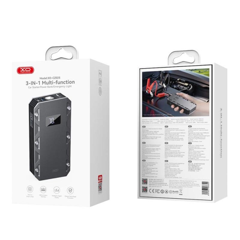 XO CZ025 Arrancador de emergência e banco de potência 3 em 1 para automóvel 10000mAh (37 Wh) - Corrente de arranque de 500A, USB-C, lanterna LED