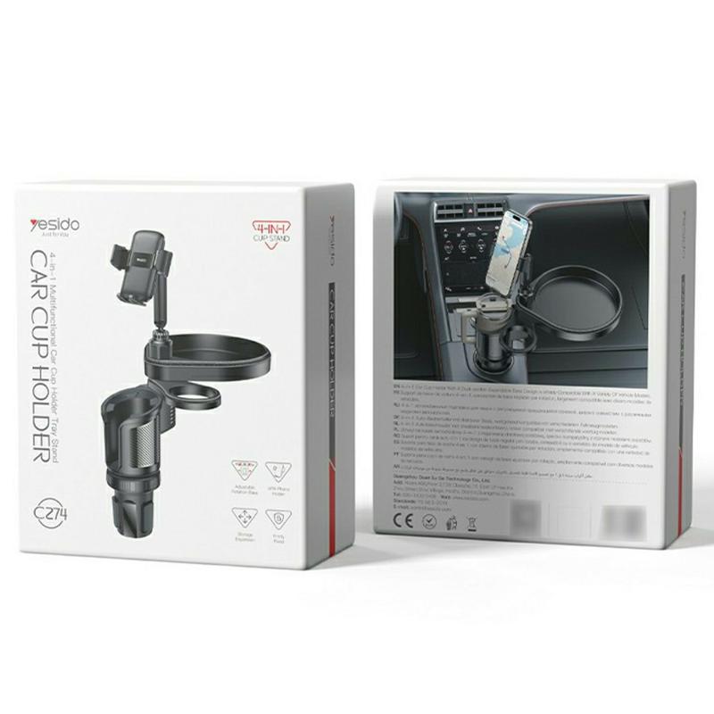 Yesido C274 4 em 1 - Organizador multifuncional de porta-copos para automóvel - Tabuleiro para alimentos, suporte expansível para bebidas e suporte ajustável para telemóvel