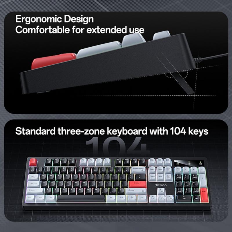 Melhore a sua experiência de digitação com o teclado mecânico com fio YESIDO KB44, um teclado de tamanho normal elegante e durável que combina um desempenho silencioso com uma retroiluminação RGB vibrante. Concebido para proporcionar conforto, longevidade e compatibilidade, é ideal para trabalhar, estudar e jogar.