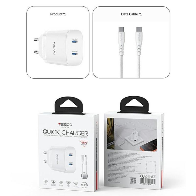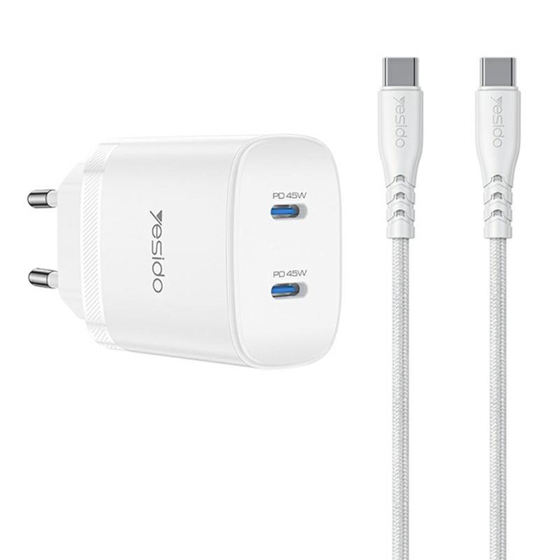 Yesido YC109 Carregador USB-C PD duplo de 45W com cabo USB-C - Adaptador de parede para carregamento rápido